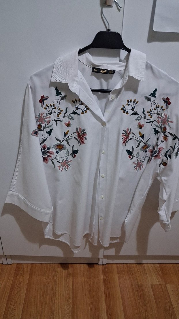 Pamuklu, nakışlı çiçek desenli beyaz gömlek. Kısa kollu, yakalı ve düğmeli, bol kesim bohem tarzda rahat bir seçim. Hiçbir kusuru yada defosu yoktur. m bedende rahatlıkla kullanır.