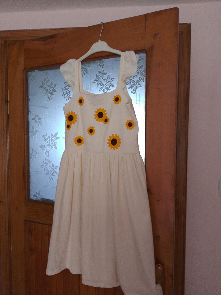 Nakışlı ayçiçeği detaylı, askısız ve bol kesim beyaz kız elbisesi, bohem tarzı için uygundur.