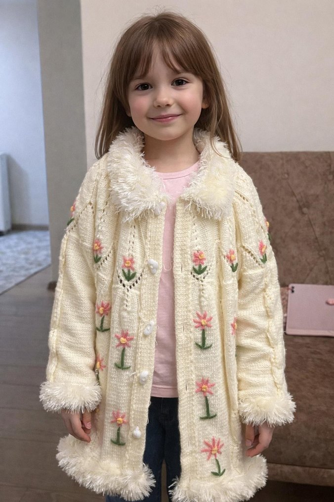 Nakışlı çiçek desenleri ve uzun kollara sahip, yumuşak dokulu kenar detayları bulunan beyaz bohem tarzı kız hırkası, bol kesim.