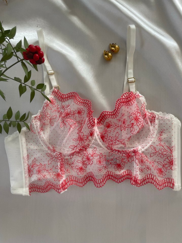 Bu beyaz sütyen, kırmızı nakış detayları ve bohem Paris tarzıyla dikkat çeker. Ayarlanabilir askıları ve midi uzunluğu rahat kullanım sağlar. Farklı bedenleri var ve 1 beden büyük alınız