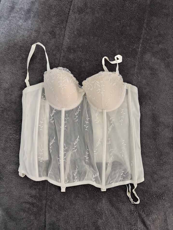Nakışlı detaylara sahip beyaz midi sütyen, bohem tarzıyla hafif ve şeffaf kumaştan üretilmiştir. Ayarlanabilir askıları rahatlık sağlar.