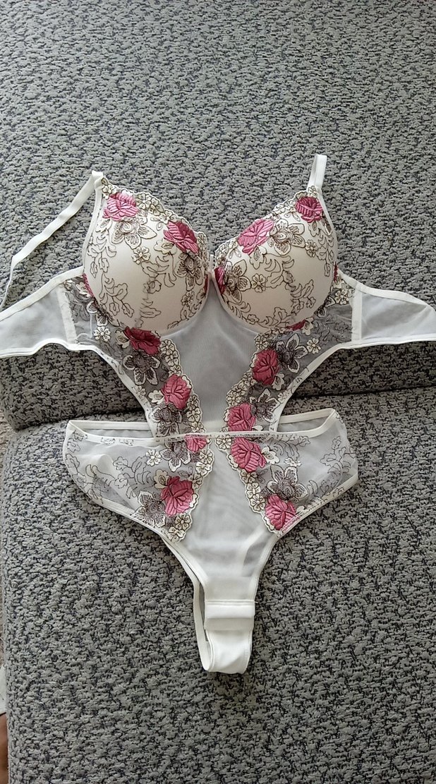 Nakışlı beyaz sütyen ve külot, pembe çiçek detaylarıyla bohem Paris tarzını yansıtıyor, midi uzunlukta ve gri tonlar içeriyor. 85b
