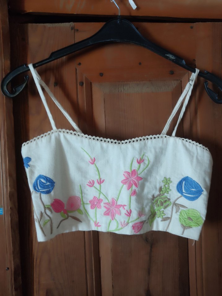 Nakışlı çiçek desenleri ve dantel detaylı, ince askılı, kısa kesim beyaz büstiyerdir. Bohem tarz için uygundur.