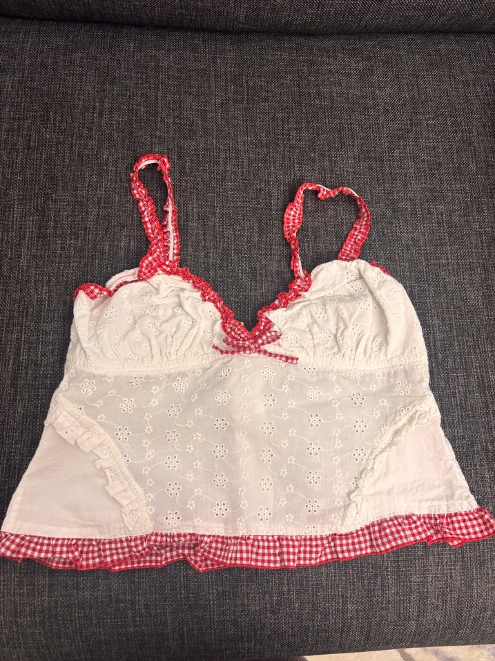 V yaka, askılı ve dantel işlemeli beyaz mini bustiyer. Kırmızı ekose detaylı, pamuklu ve bohem tarzda, vücuda oturan kesime sahip.