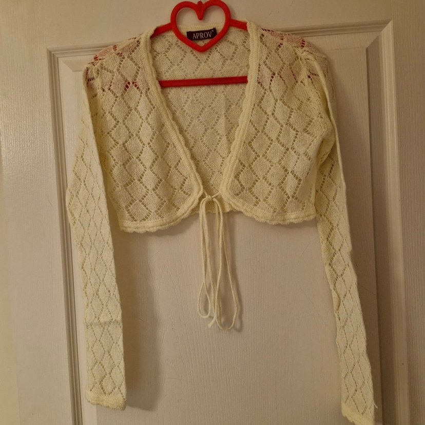 Nakışlı desenli, uzun kollu, straplez yakalı, önden bağlamalı krem bohem örgü hırka, günlük kullanıma uygun