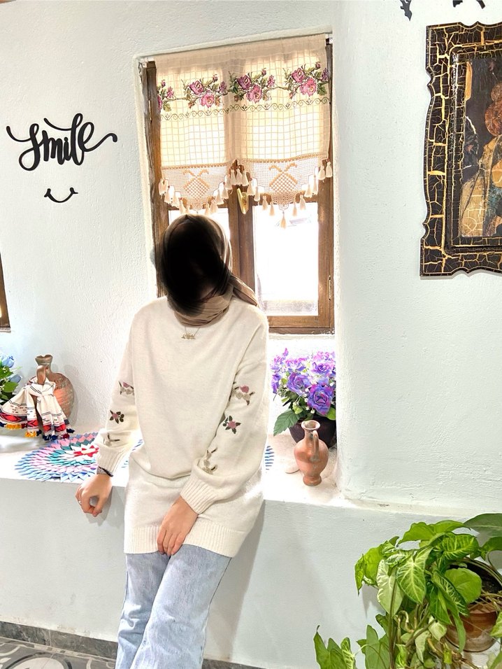 Nakışlı çiçek detaylı uzun kollu beyaz örgü kazak, bohem tarzda midi uzunlukta ve bol kesimdir.