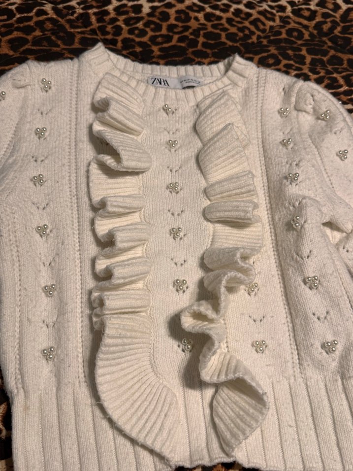 Nakışlı ve fırfırlı detaylara sahip beyaz örgü kazak, uzun kollu ve yuvarlak yakalıdır. İnci detaylı ve rahat, bohem stilde.