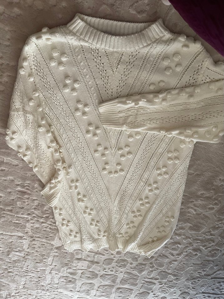 Nakışlı desenlere sahip beyaz örgü kazak, uzun kollu ve yuvarlak yaka tasarımıyla rahat bohem bir stil sunar. 1 kez giyildi uzun kazak