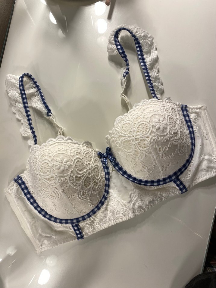 Mavi kareli askıları ve detaylı nakışıyla beyaz, Paris ve bohem tarzlarını birleştiren şık sütyen.