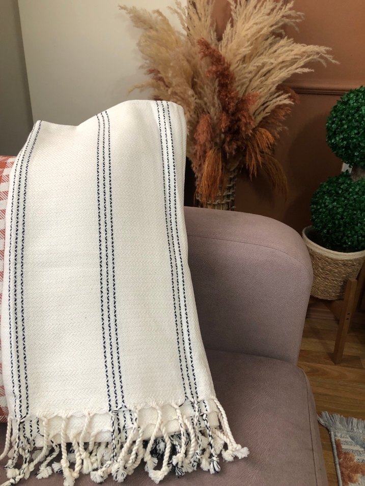 Siyah nakışlı çizgiler ve püsküllü kenarlarla beyaz bohem tarzda peştemal, yumuşak ve doğal dokuda. ♀️
