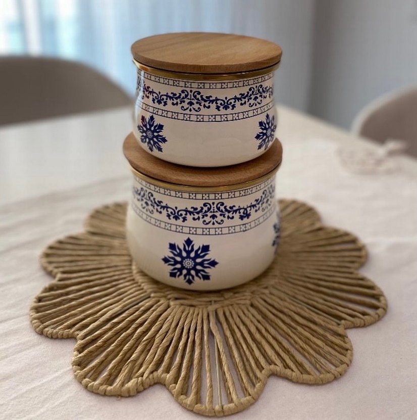 Ahşap kapaklı, nakış desenli mavi motiflere sahip iki beyaz seramik kavanoz. Bohem tarzda şık saklama için uygundur. Emaye