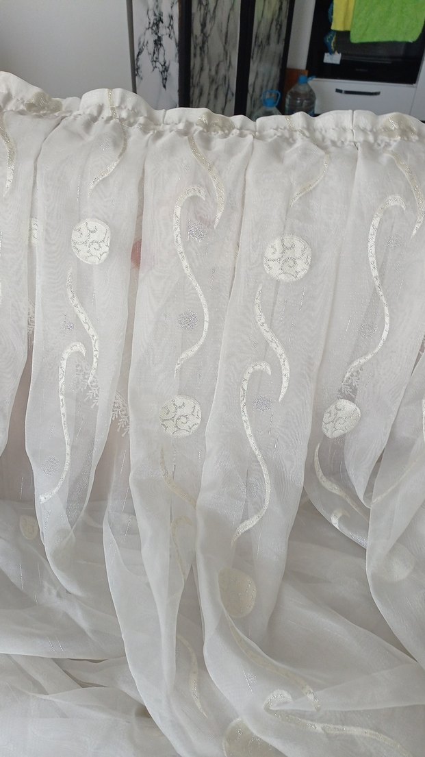 Hafif beyaz tül perde, nakışlı desenlerle bohem tarzında, odaya yumuşak ve zarif bir hava katıyor. üç adet tül herangi sorunu yok nemli takılırsa ütü istemiyor 2,20 en boy 2,5 üçünün ölçüleri aynı vereceğim fiat üçü için geçerli