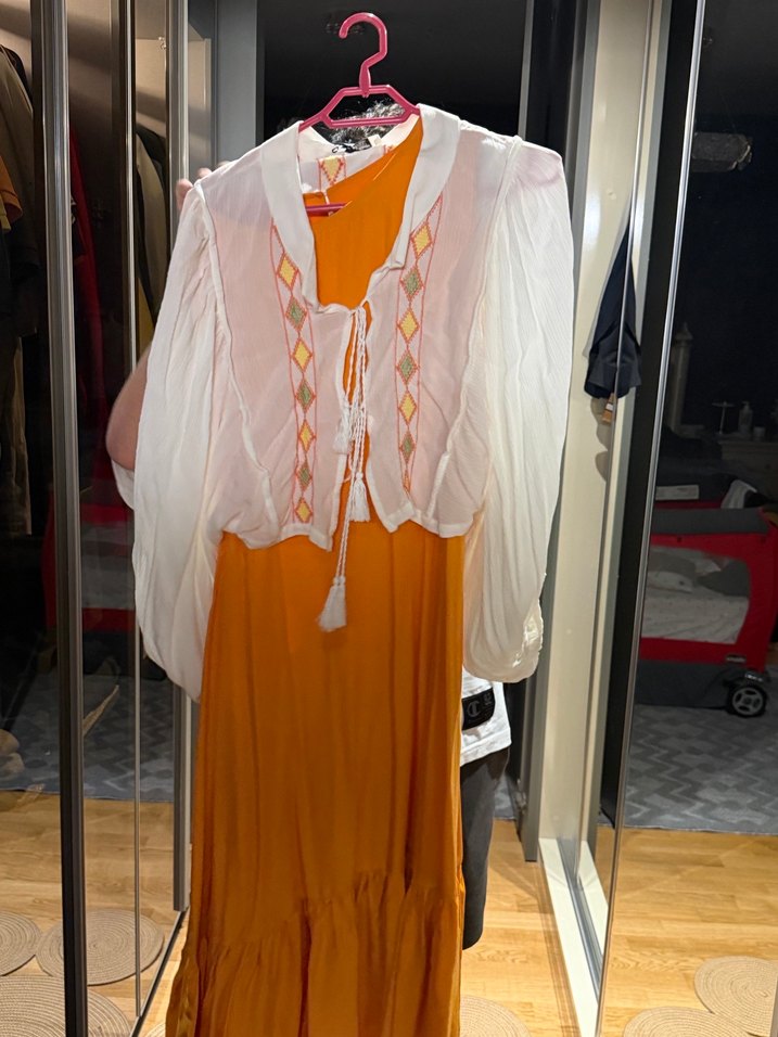 Nakışlı detaylara sahip beyaz, uzun ve bol kesim elbise. V yaka ve drapeli uzun kolludur, yumuşak sentetik kumaştan yapılmıştır.