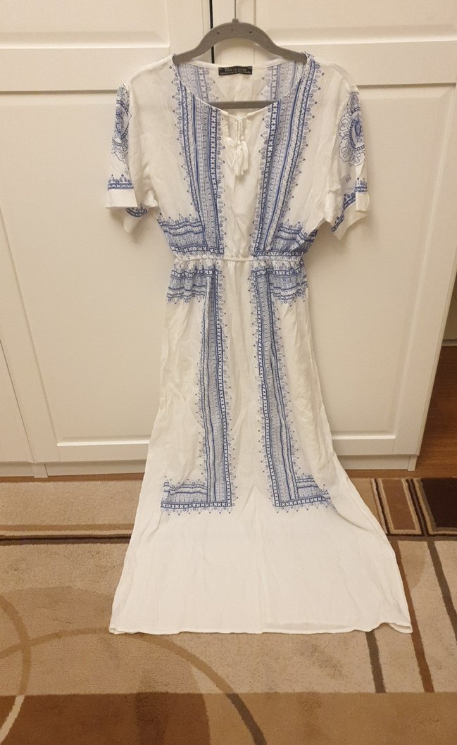 Mavi nakış detaylı, pamuklu beyaz elbise. V yaka, kısa kollu, bol kesim ve dökümlü tasarıma sahip bohem tarz elbise.