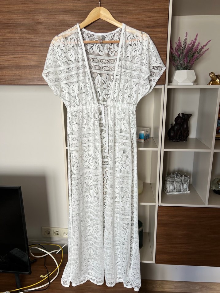Nakışlı desenlerle süslenmiş, kolsuz, rahat kesimli beyaz bohem uzun elbise, hafif ve ferah bir kullanım sunar. S/M bedeni
