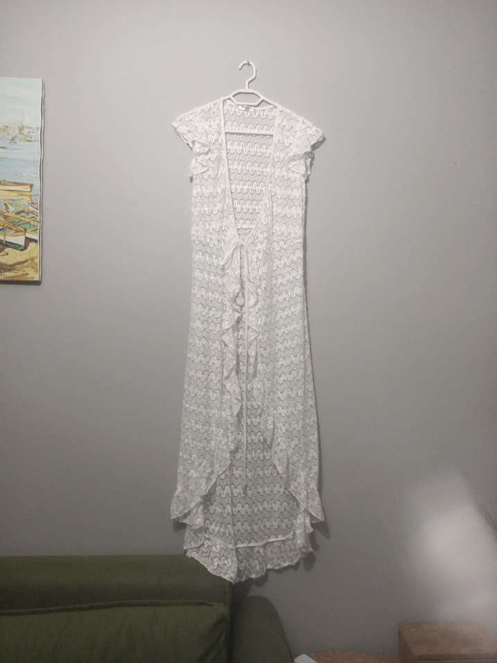 Nakışlı desenlere sahip beyaz, bohem tarzda uzun kadın elbisesi. Kolsuz ve rahat kesimli, yumuşak kumaştan üretilmiştir.