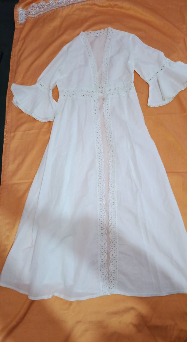 Vintage Nakışlı detaylara sahip, uzun ve beyaz renkte bol kesim kadın SABAHLIK. Uzun ve volanlı kollara sahiptir, bohem tarzı için uygundur.