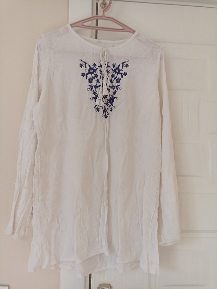 Uzun kollu, V yakalı beyaz pamuk bluz, nakış detaylı ve düğmeli. Bol kesim, bohem tarzda, günlük kullanıma uygun. az kullanıldı defosu yoktur 40 beden