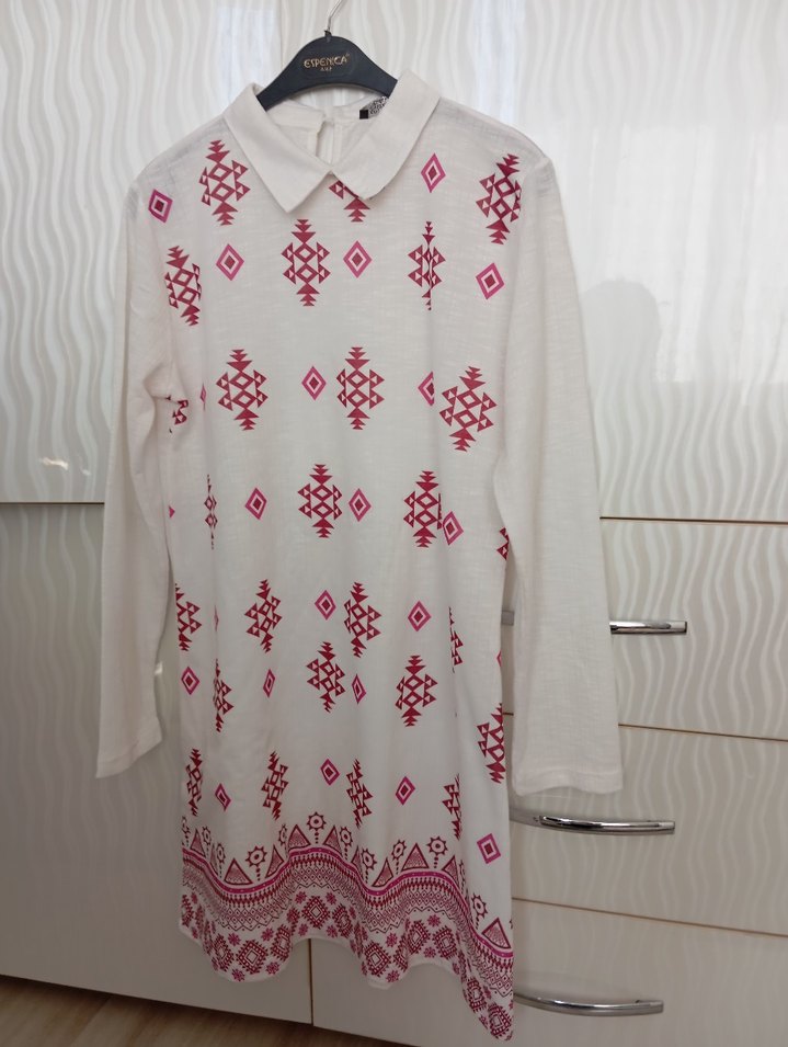 Kırmızı nakış desenli, beyaz renkli, uzun kollu, yuvarlak yakalı, örme dokulu bol kesim bohem tunik. Günlük kullanım için uygundur.