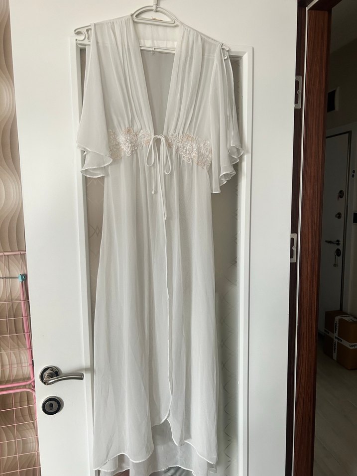 Bu beyaz bohem tarzı kap, bol kesim ve narin nakış detaylarıyla, kolsuz tasarım ve belde bağcık ile tamamlanmıştır. Yumuşak, akışkan kumaş ve pastel tonlar içerir.