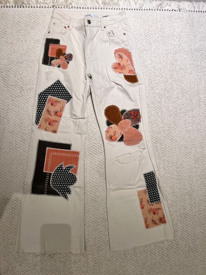 Nakışlı çiçek ve geometrik desenli yamalarla süslenmiş, düğmeli, bol kesim beyaz tekstil kot pantolon.