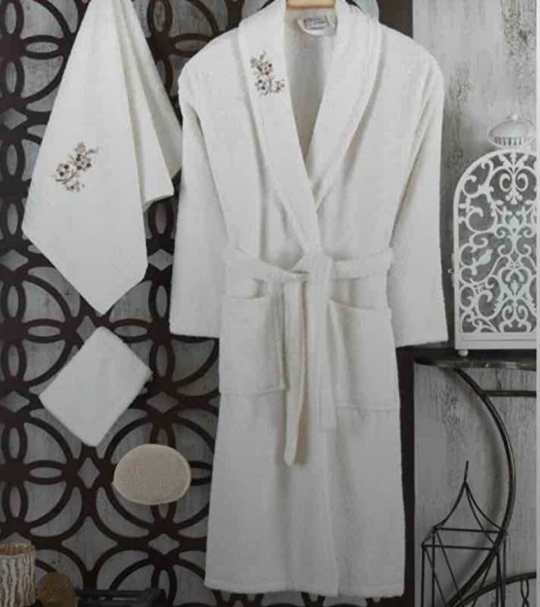 Gri nakışlı çiçek detaylı beyaz bornoz ve peştemal seti. Kuşaklı ve cepli, konvansiyonel tarzda rahat kullanım sağlar.