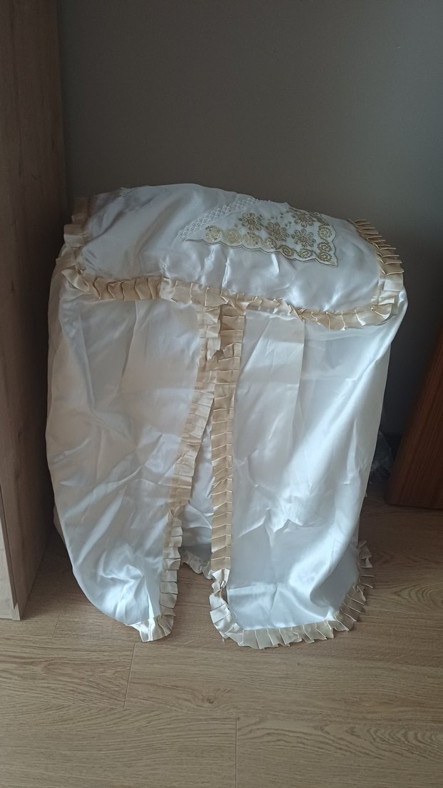 Nakışlı detaylara sahip parlak beyaz kumaştan, camasir makinasi ortusu firfirli