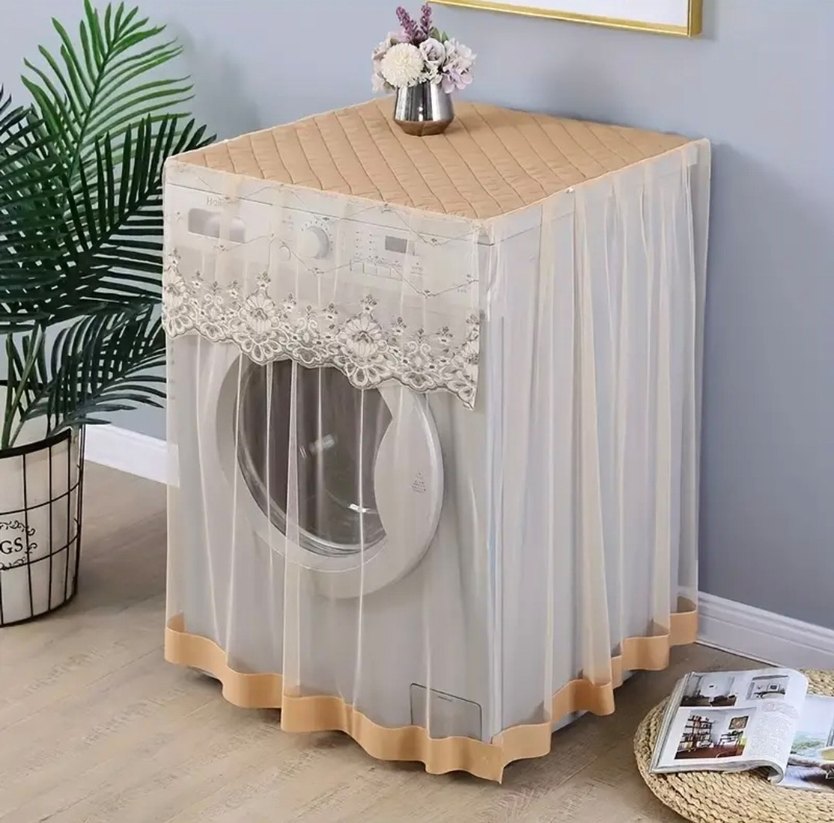 Beyaz nakışlı, şeffaf ve açık renk kumaşla çamaşır makinesi örtüsü. Bej kenar detayları ve yumuşak dokusu bulunur 11 kilyo kadar makineye uygundur 85/65 ölçülerinde cüzi indirim olur