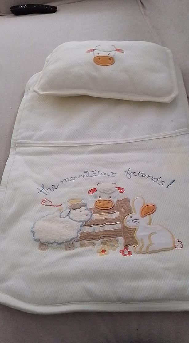 Yumuşak kumaştan yapılmış beyaz çocuk uyku seti, nakışlı inek, koyun ve tavşan figürleri ile pastel tonlarda alt açma