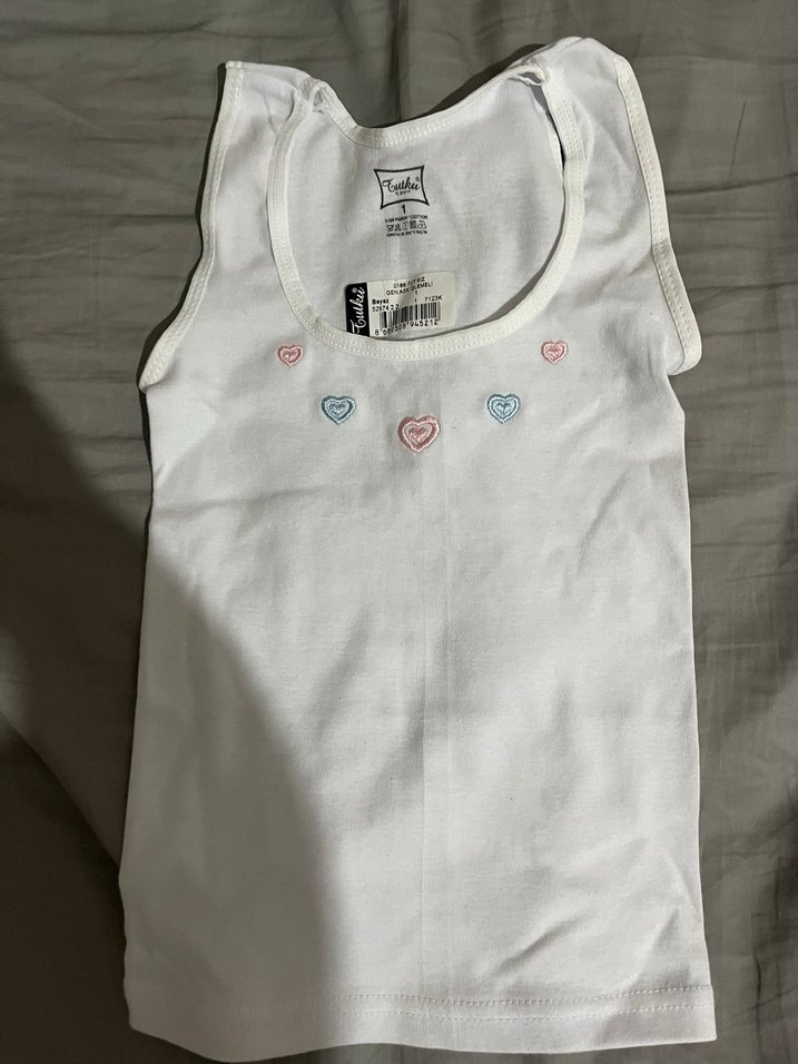 Yumuşak kumaştan, göğüs kısmında pastel renklerde nakışlı kalpler bulunan beyaz çocuk atleti.