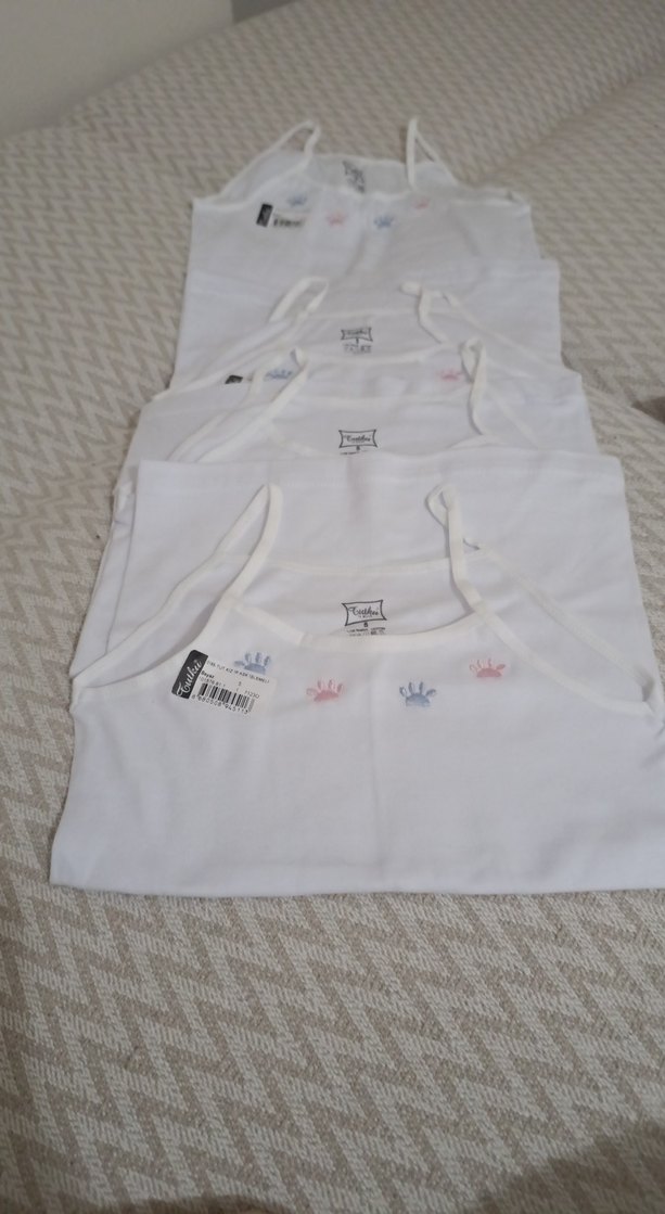 Yumuşak kumaştan, pastel renkli nakışlı taç desenlerine sahip beyaz çocuk atletleri. Rahat kullanım sağlar.