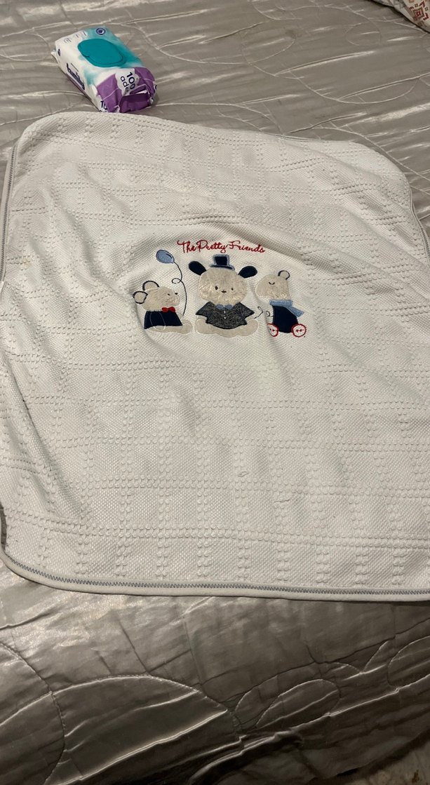 Yumuşak beyaz çocuk battaniyesi, nakışlı ayı desenleri ve hafif kareli desenle. Açık gri tonlar nazik kontrast sağlar.