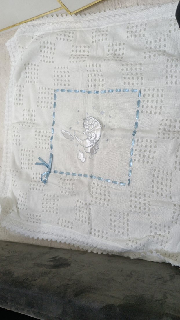 Beyaz renkte, nakışlı detaylara ve açık mavi kenarlığa sahip yumuşak dokulu çocuk battaniyesi. Küçük bir fiyonk detayı bulunur.