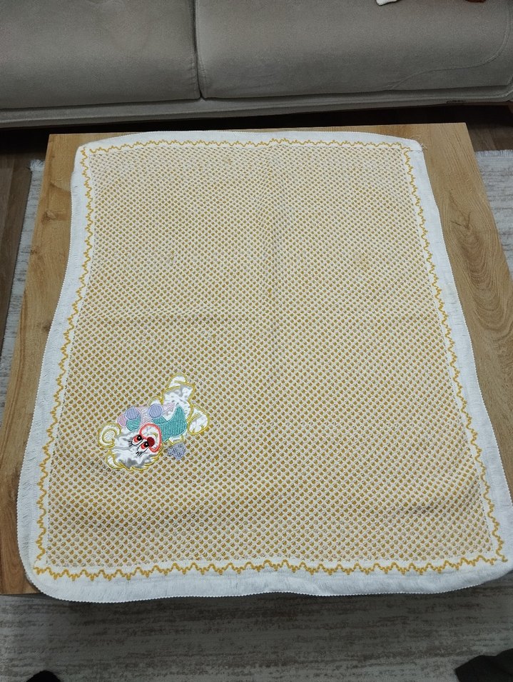 Yumuşak tekstil malzemeden yapılmış, pastel renklerde nakışlı beyaz çocuk battaniyesi.