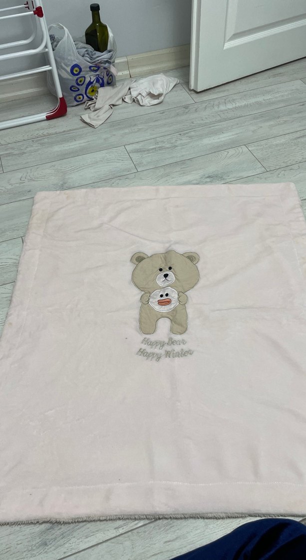 Pastel beyaz renkte, yumuşak ve sıcak çocuk battaniyesi. Üzerinde nakışlı ayı deseni bulunur.