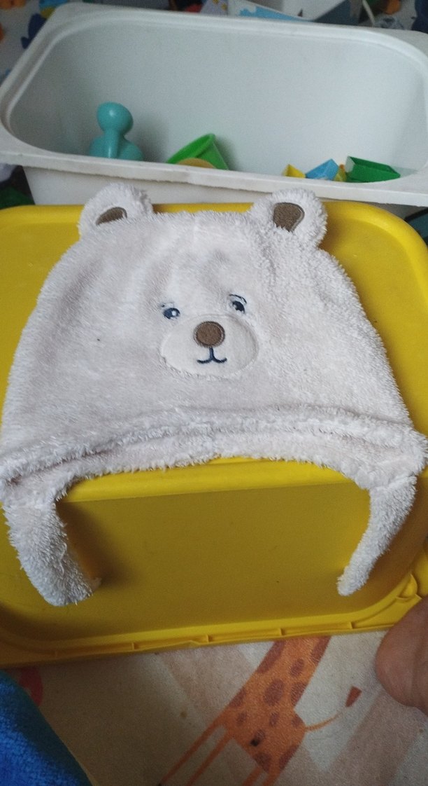Yumuşak ve sıcak beyaz çocuk beresi, renkli nakışlı ayı yüzü ve kulaklarla, rahat kumaştan yapılmıştır.