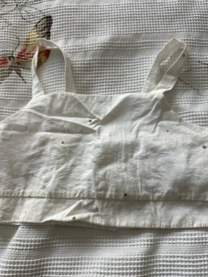Pastel tonlarda nakışlı detaylara sahip beyaz crop Omuz askıları ve yumuşak kumaş dokusu bulunur.