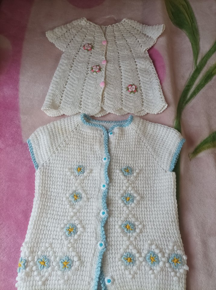 Nakışlı çiçek desenli, beyaz pastel tonlarında, kolsuz ve dar kesim örgü yelekler. Düğmeli ve klasik tarzda.