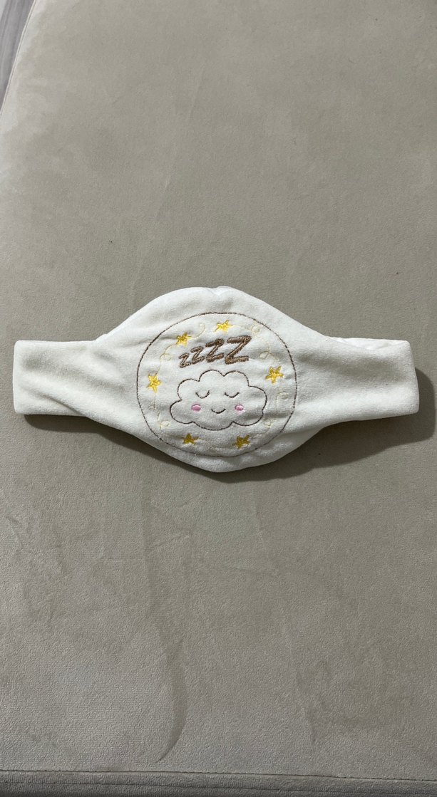 Yumuşak ve sıcak kumaştan yapılmış, nakışlı bulut ve yıldız desenli beyaz pastel çocuk uyku bandı, uyku sırasında nazik konfor sağlar .