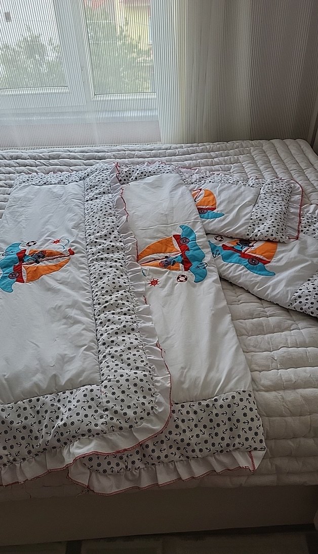 Nakışlı renkli desenlere sahip beyaz sentetik kumaştan çocuk uyku seti, yastık ve fırfırlı kenarlarıyla birlikte. besik korumaligi 1 ay iullildi sorunsuz