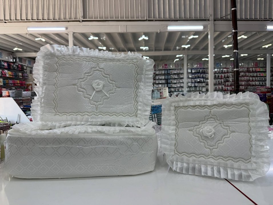 Nakışlı desenlere sahip beyaz çocuk uyku seti, yumuşak sentetik kumaştan yapılmıştır. Fırfırlı kenar detayları ile yastık ve yatak örtüsü içerir. ️