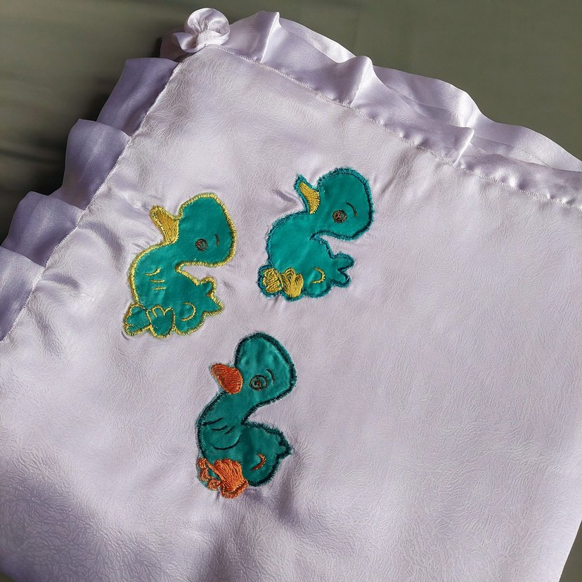Beyaz renkte, ipeksi dokulu çocuk örtüsü, nakışlı pastel tonlarda ördek desenleriyle süslenmiştir.