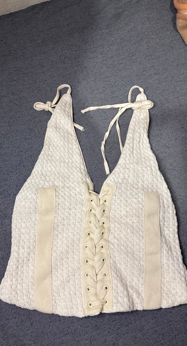 Nakışlı ve bağcıklı ön tasarıma sahip, vücuda oturan beyaz crop . Midi boyunda ve hafif krem tonları içerir.