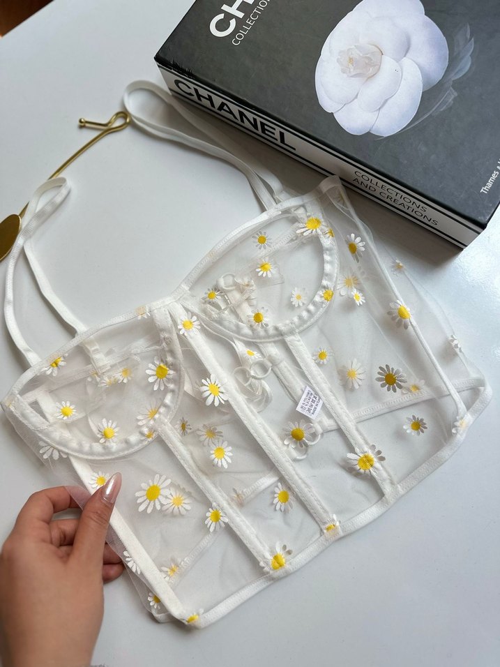 Bu beyaz, straplez büstiyer, dantel detaylı ve nakışlı papatya desenleriyle hafif sentetik kumaştan, bohem Paris tarzını yansıtıyor. S/M bedenler mevcuttur