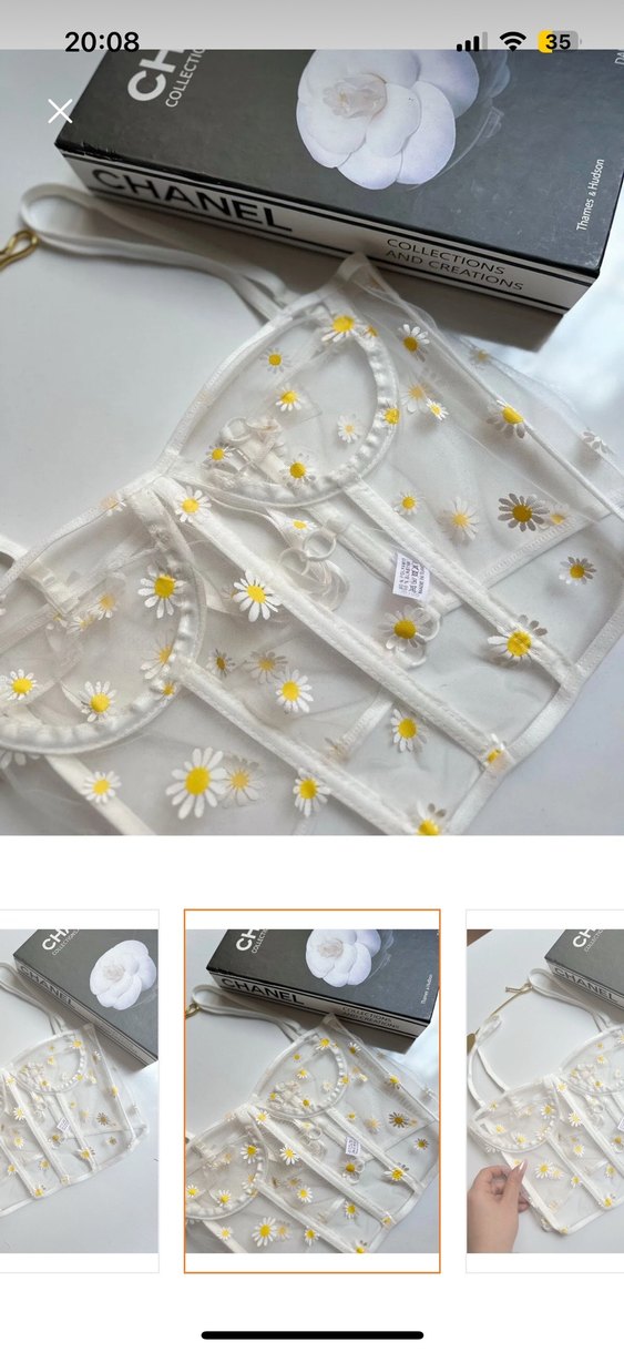 Nakışlı papatya desenli, dantelli beyaz straplez bustiyer. Sentetik kumaştan, fitted midi boy ve ince askılı tasarıma sahip, bohem tarz için ideal. Kullanmadım