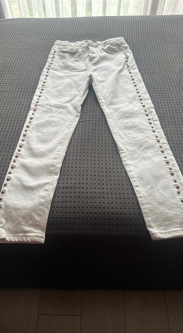 Düğmeli ve yanlarında nakış detaylı beyaz pamuklu kot pantolon. Regular fit ve midi boy, günlük rahat stil için uygundur.