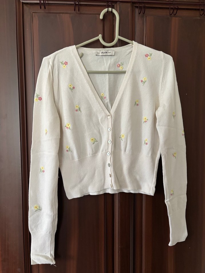Nakışlı çiçek detaylı beyaz düğmeli hırka, uzun kollu ve triko kumaştan. V yaka, midi uzunlukta ve fitted kesim, streetwear tarzına uygun.
