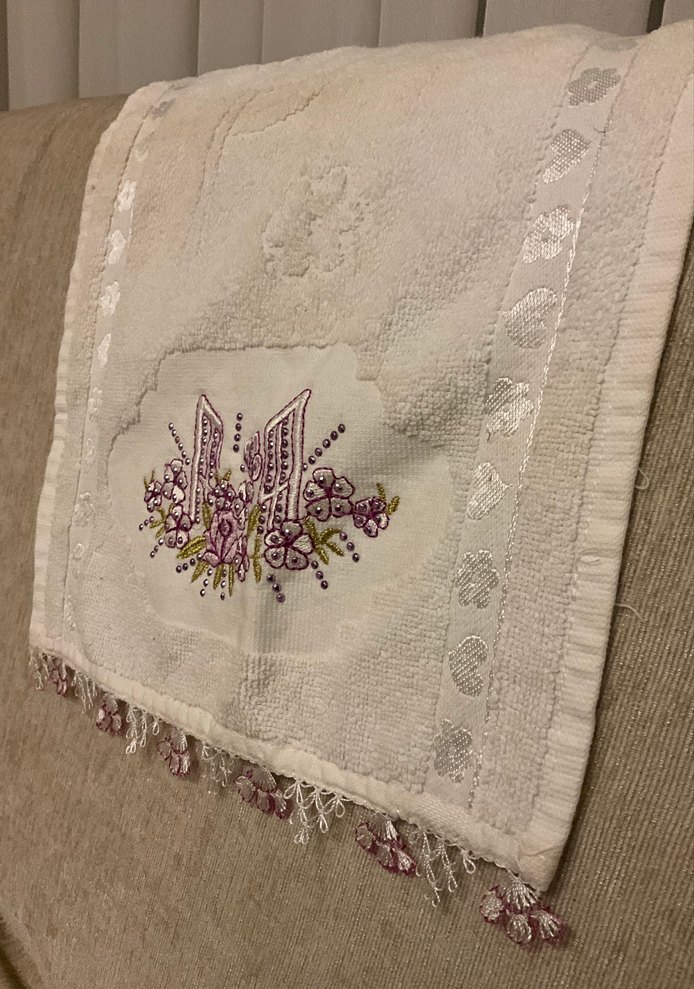 Bu beyaz havlu, zarif nakışlı çiçek desenleri ve kenarında pastel renkli püsküller içerir. Geleneksel tarzda ve yumuşak dokuludur. Biraz sarı lekeler vardır