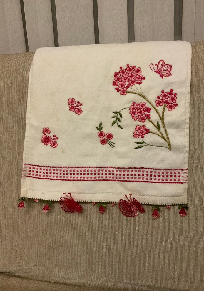 Beyaz havlu, pembe çiçek nakışları ve süslü püsküllerle zarif bir görünüm sunar. Biraz sarı lekeler vardır