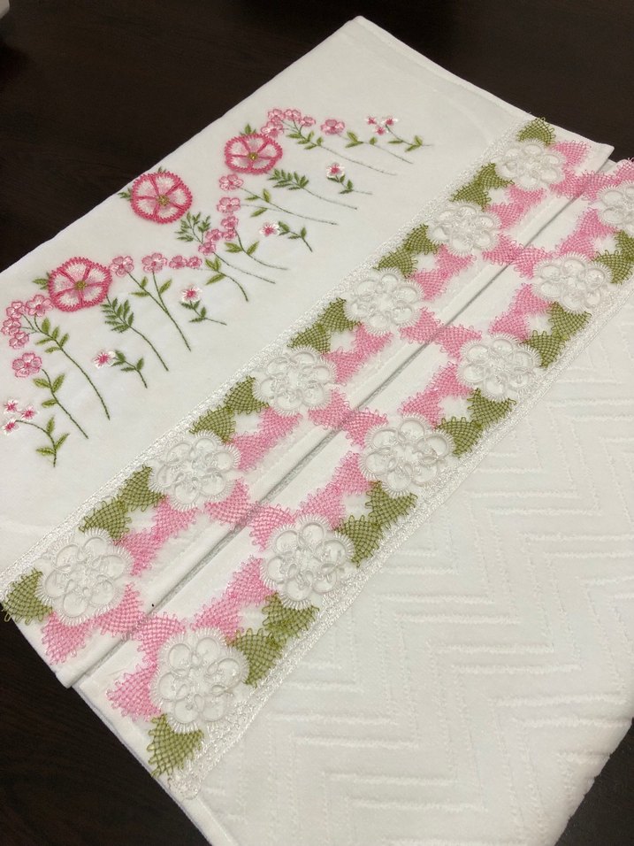 Pastel pembe ve yeşil nakışlı çiçek desenleri ve dantel detaylı beyaz el havlusu. Yumuşak ve klasik tarzda havlu. Renk belirtip ilan açtırınız